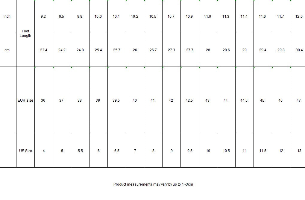 | EUR size | 36 | 37 | 38 | 39 | 39.5 | 40 | 41 | 42 | 42.5 | 43 | 44 | 44.5 | 45 | 46 | 47 | |